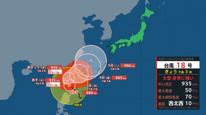 「台風18号」は「大型」で「非常に強い勢力」のまま、北緯20度30分、東経121度10分を中心に『バシー海峡』で西北西方向に時速10kmの速さで進んでいるとみられています。中心の気圧は935ヘクトパスカルで中心付近の最大風速は50メートル、最大瞬間風速は70メートルとなっています。台風の全域150kmが秒速25m以上の暴風域で、全域500kmが秒速15m以上の強風域となっています。