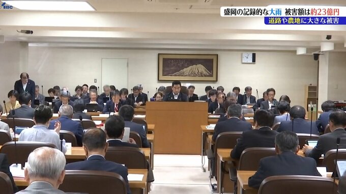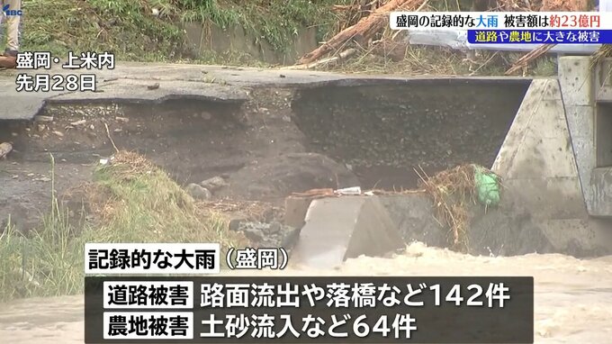 8月27日の記録的な大雨で盛岡市では、路面が流出したり橋が落ちたりする道路被害が142件、土砂の流入などの農地被害が64件確認されていて、住宅被害などと合わせた被害額は30日時点で23億2000万円ほどに上っています。