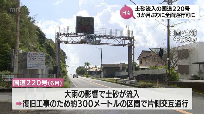 今年6月、大雨による土砂の流入で片側交互通行が続いていた日南市の国道220号の一部区間が、30日夕方から3か月ぶりに全面通行となりました。ただ、8月の地震による落石で片側交互通行となっている区間では、今も復…