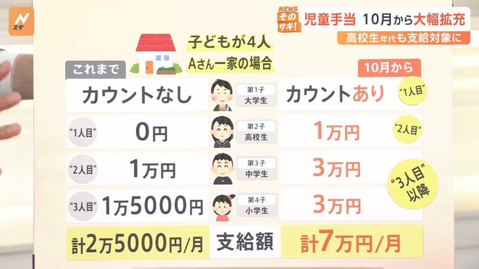 これまで中学生以下が支給の対象で、第1子の大学生は“子ども”とカウントされていませんでした。第2子の高校生は1人目にカウントされますが、支給はありませんでした。第3子の中学生は2人目とカウントされ、1万円が支給されました。第4子の小学生は3人目とカウントされ、1万5000円が支給されました。合計は月に2万5000円でした。