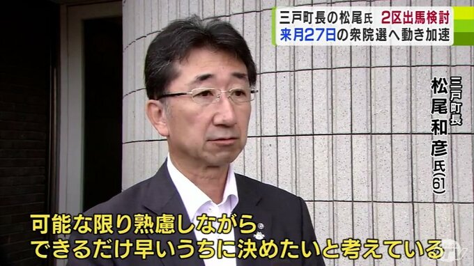 自民党の石破茂新総裁が10月27日に投開票とする意向を示した「次の衆議院議員選挙」についてです。立憲民主党の候補が空白となっている『青森2区』に、三戸町長の松尾和彦氏が出馬を前向きに検討するなど動きが加…