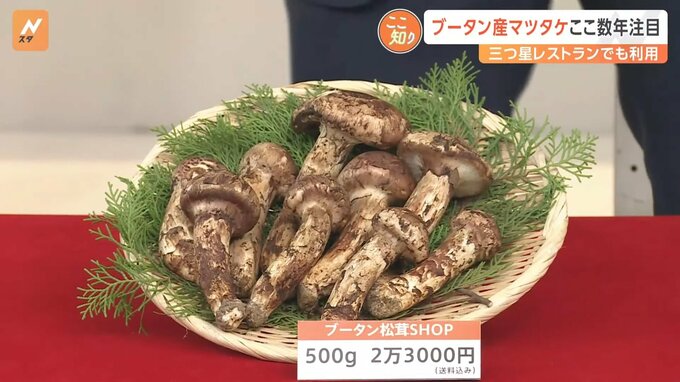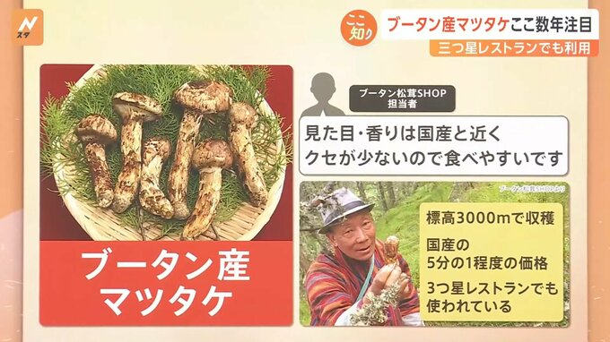 「ブータン松茸SHOP」の担当者は、「見た目・香りは国産と近く、クセが少ないので食べやすい」としています。▼標高3000メートルで収穫され、▼国産の5分の1程度の価格、▼国内の3つ星レストランでも使われているとのことです。虫食いが少ないため、レストランでも重宝されているといいます。