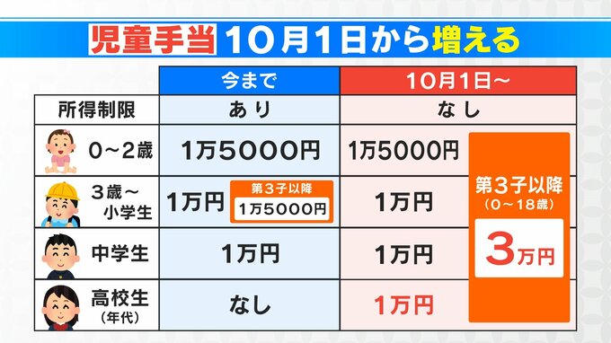 これまで親の所得額が多い場合は、児童手当の減額や対象外など所得制限がありましたが、10月からはそうした所得制限も撤廃され、支援が拡充されるということです。