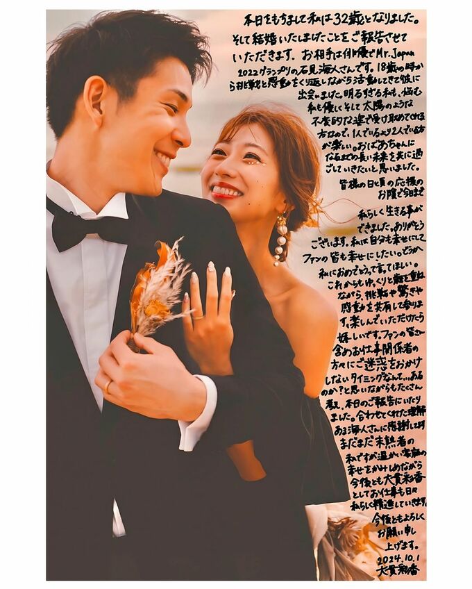 一方の、大貫彩香さんは「私事ではございますが結婚いたしましたことをご報告させていただきます。お相手は俳優でMr.JAPAN2022グランプリの石見海人さんです。」と、報告。