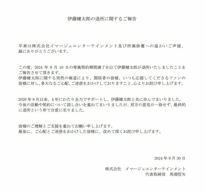 この度、2024 年 9 月 10 日の専属契約期間満了を以て伊藤健太郎が退所いたしましたことをご報告させて頂きます。