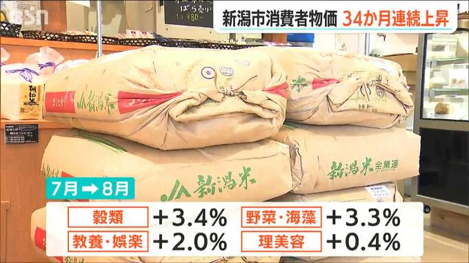 7月との比較ではコメの品薄などにより穀類が3.4パーセント、野菜・海藻が3.3パーセントと上昇が止まらず総合指数は34か月連続の上昇です。