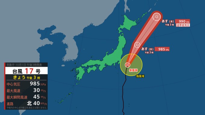 台風第17号は、銚子市の南東約160キロを1時間におよそ40キロの速さで北へ進んでいます。台風第17号は、1日15時には銚子市の南東約160キロの北緯34度50分、東経142度10分にあって、1時間におよそ40キロの速さで北へ進んでいます。中心の気圧は985ヘクトパスカル中心付近の最大風速は30メートル、最大瞬間風速は45メートルで中心から半径55キロ以内では風速25メートル以上の暴風となっています。また、中心の東側330キロ以内と西側165キロ以内では風速15メートル以上の強い風が吹いています。