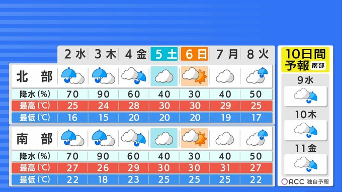 この先、金曜日にかけては前線の影響でぐずついた天気になるでしょう。来週もしばらくすっきりしない天気になります。気温は、あさってにかけて平年並からやや高いくらいに落ち着きそうですが、金曜日以降は上空の高気圧の勢力が再び強まり真夏日になる地点もある見込みです。もうしばらく熱中症に警戒が必要な期間は続きそうです。