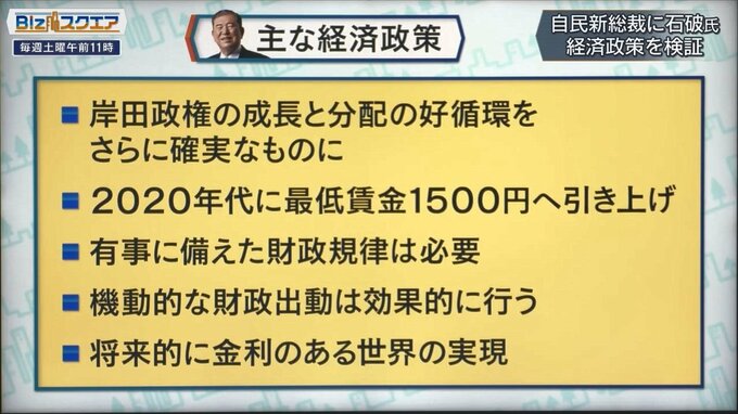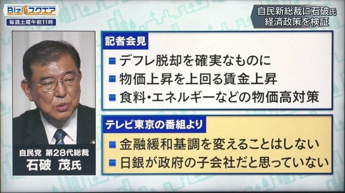 石破氏の発言を振り返る。「デフレ脱却を確実なもの」とし、「物価上昇を上回る賃金上昇」さらに「食料・エネルギーなどの物価高対策」などに言及。またテレビ番組に出演し「金融緩和基調を変えることはしない」「日銀が政府の子会社だと思っていない」などといった発言もあった。さらに補正予算で食糧エネルギーなどの物価高対策をやりたいとも明言した。