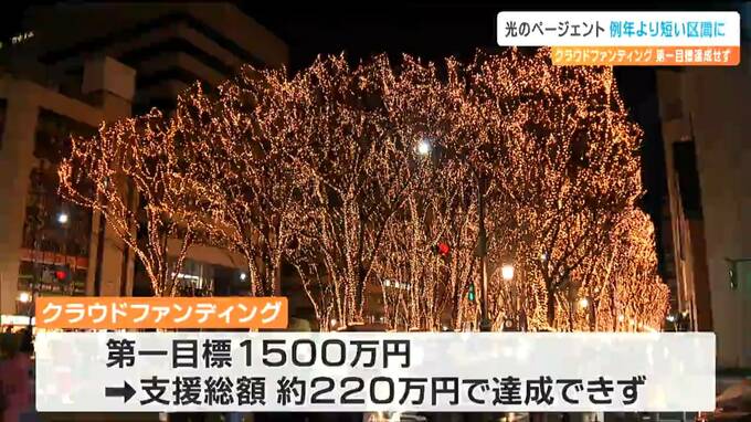 仙台の冬の風物詩SENDAI光のページェント。実行委員会は物価や人件費の高騰による資金不足を受け30日までの1ヶ月間、クラウドファンディングを募りました。達成金額により点灯区間を決める予定で、第一目標を1500万円としていましたが支援総額は、およそ220万円で達成できませんでした。