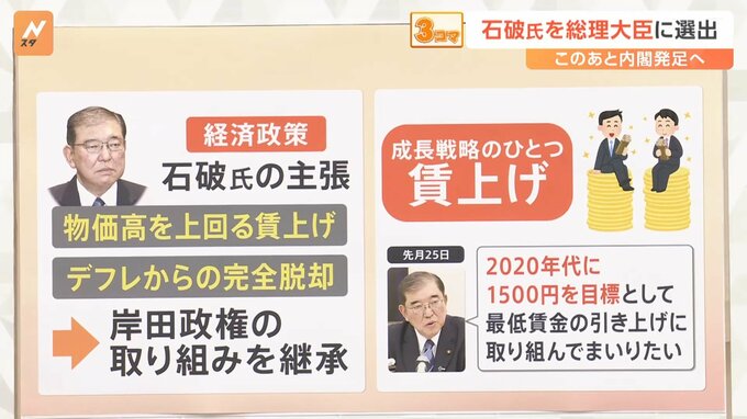 経済政策について石破氏は「物価高を上回る賃上げ」、「デフレからの完全脱却」を掲げていました。これらは岸田政権の取り組みを継承した形です。成長戦略のひとつとして「賃上げ」を掲げています。