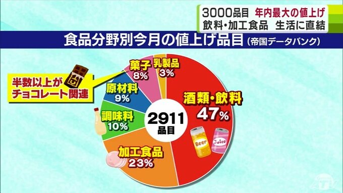 分野別ではペットボトル飲料を中心とした「酒類・飲料」が最も多く全体の約5割を占めています。続いてハムなどの加工食品や調味料となっていて「菓子」は値上げとなる商品の半数以上がチョコレート関連です。
