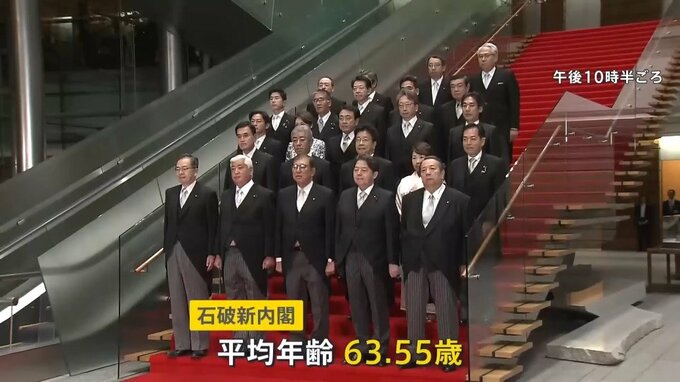 官邸の階段で写真撮影をおこなった石破新内閣の閣僚たち。総理を含めた20人の平均年齢は63.55歳、女性は2人で、初入閣が13人となりました。