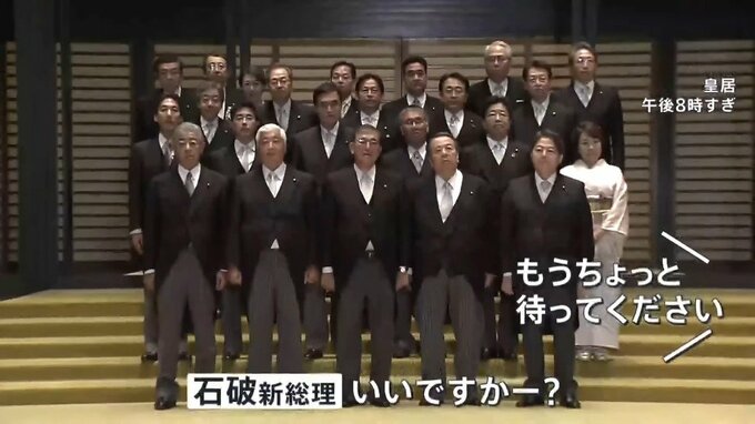 皇居での親任式と認証式を終え、記念撮影に臨んだ石破新内閣。