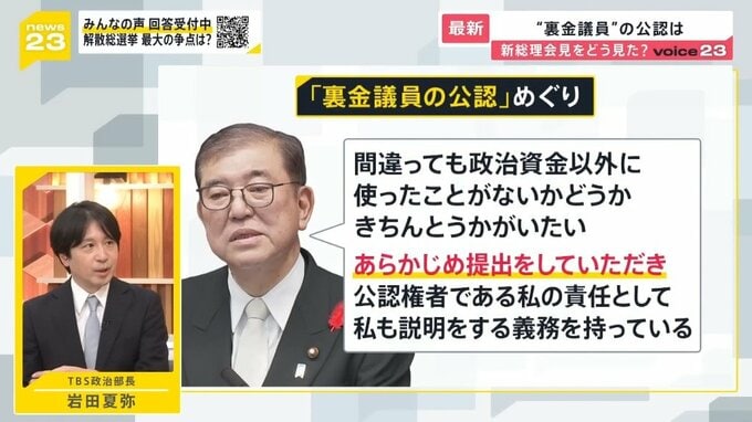 それからもう一つ、裏金議員の公認をめぐっては「間違っても政治資金以外に使ったことがないかどうか、きちんとうかがいたい。あらかじめ提出をしていただき、公認権者である私の責任として、私も説明をする義務を持っている」のことでした。