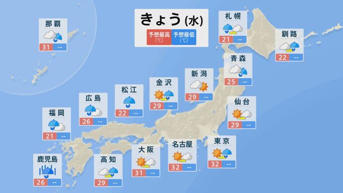 一方、前線の影響で西日本を中心に雨の降るところがあるでしょう。前線の南側にあたる太平洋側では予想最高気温が30度を超えるところもありそうです。