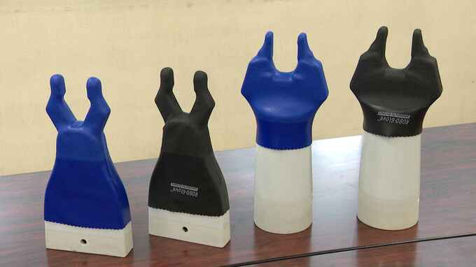 一方、ロボグローブを装着すると・・・潤滑油を張った水槽の中でも、ロボットの指先が金属をしっかりつかみ、落とさずに移動させることができました。