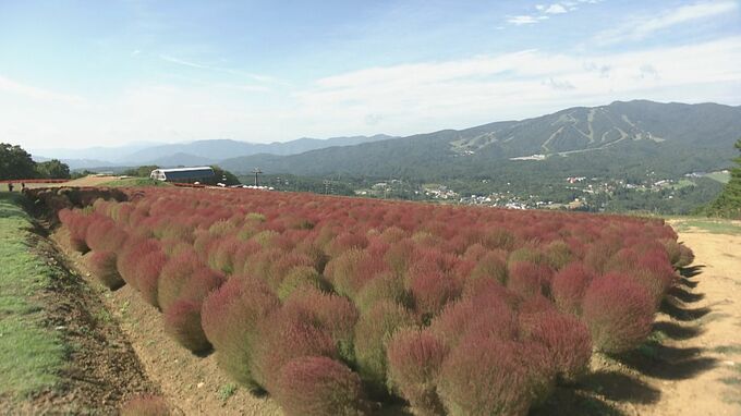 標高1000メートルにある郡上市の「ひるがのピクニックガーデン」では、約1万株のコキアが赤く染まり、秋の訪れを告げています。
