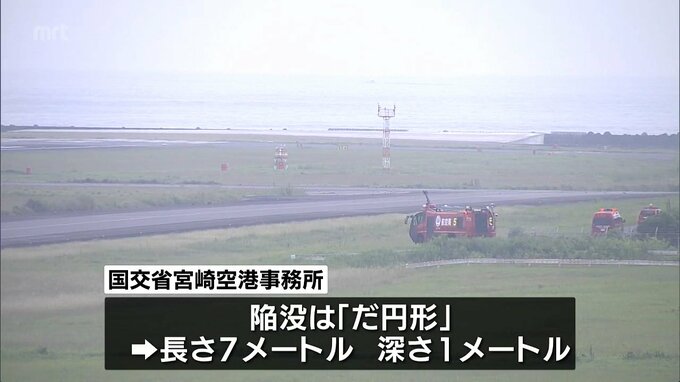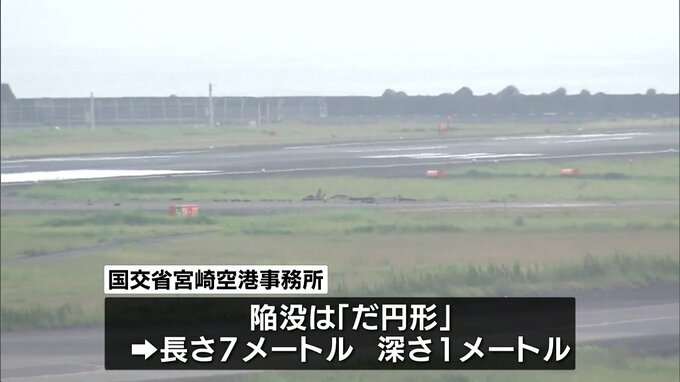 国土交通省宮崎空港事務所によりますと、陥没は、だ円形にできていて、長い場所では7メートル、深さは1メートルあるということです。