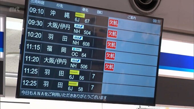 現在、宮崎空港の滑走路は閉鎖されていて、出発カウンターは利用客で混雑しています。