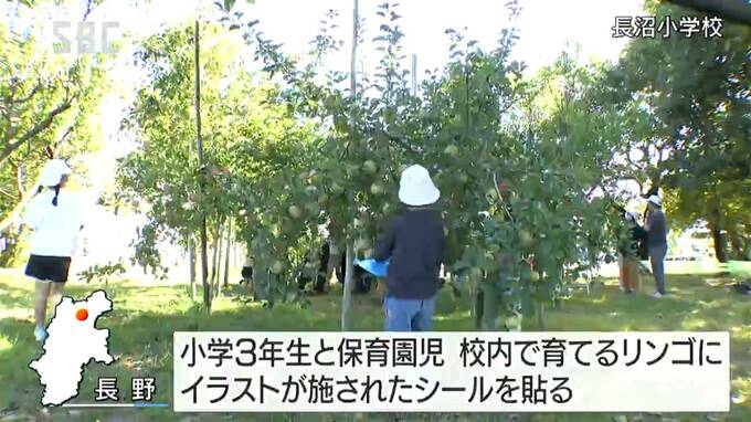 長野市津野(つの)の長沼小学校には、3年生と長沼保育園の園児あわせて30人ほどが集まり、校内で育てるリンゴにイラストが施されたシールを貼りました。