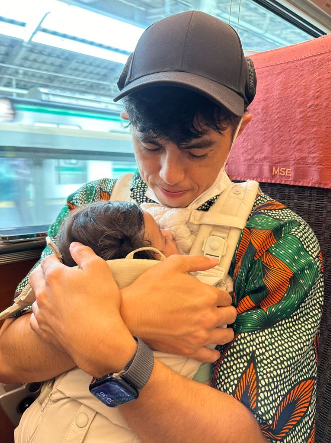 投稿では、電車内のシートに座って、身体の前側に抱っこひもを回した小島さんが、子どもを抱きしめて目を伏せている写真が添えてあり、「先日のお出かけ模様。ぐっすり寝ています」と、目がハートの笑顔の顔文字で、溺愛ぶりが表現されています。