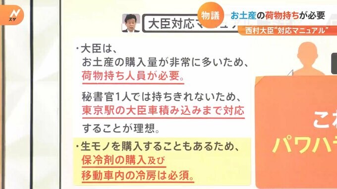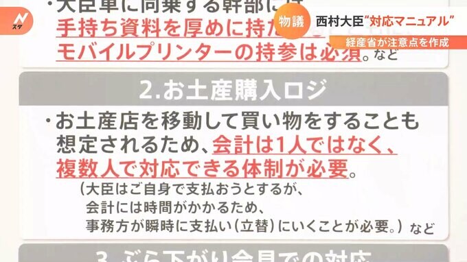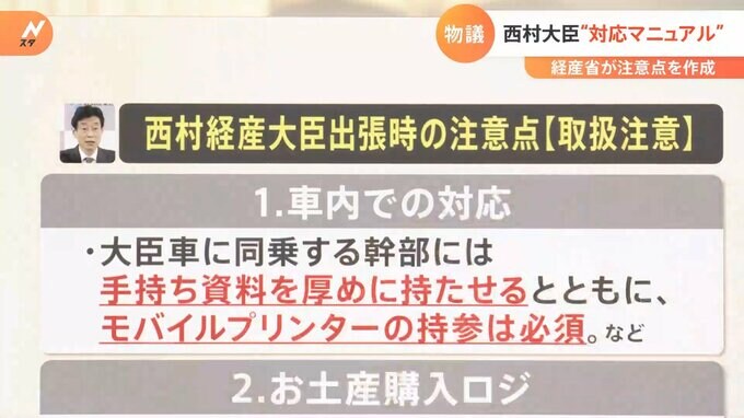 この西村大臣が出張するときの“対応マニュアル”。これが明らかになったということです。タイトルは「西村経産大臣出張時の注意点【取り扱い注意】」そしてその内容が