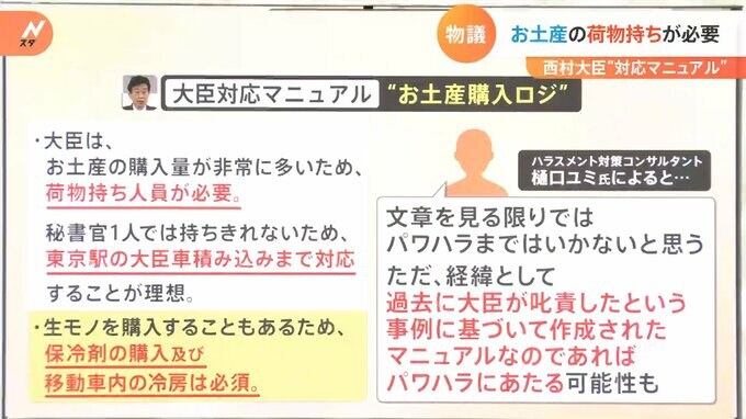 他の大臣もあるのであれば、内容としては結構好感度が上がりますね。「自分で支払おうとするので」とか「お土産をたくさん買って」とかは地域の経済を回しているんだなと。内容はポジティブに捉えたんですけど、西村大臣が「マニュアルを作れ」って言ったのか、単純にすごく真面目な事務方が「何か起きないように」っていうので作ったのかみたいなのが気になります。