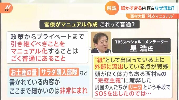 「政策からプライベートまで引き継ぐべきことをマニュアル化することは、ごく普通にあること。ただしお土産の量、サラダ購入部隊など書かれている内容が、ここまで細かいのは非常にまれ。紙として出回っている上に、外部に流出している点が特殊。頭が良く体力もある西村氏の“完璧主義”に疲弊した周囲の人たちが『リーク』という手段でSOSを出したのでは・・・」