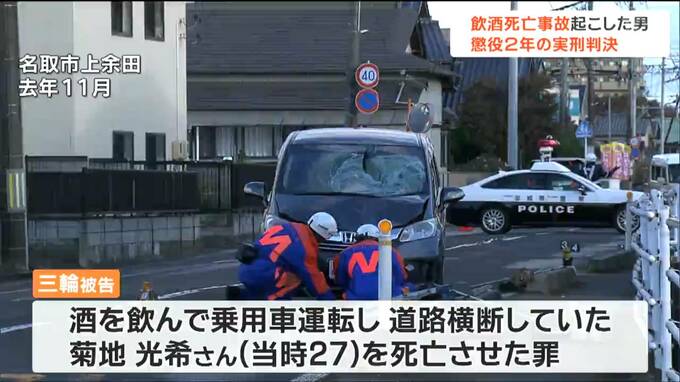 判決などによりますと、三輪被告は去年11月、名取市上余田の県道で、酒を飲んで乗用車を運転し、道路を歩いて渡っていた仙台市太白区中田三丁目のアルバイト・菊地光希さん当時27歳をはね、死亡させた罪に問われています。
