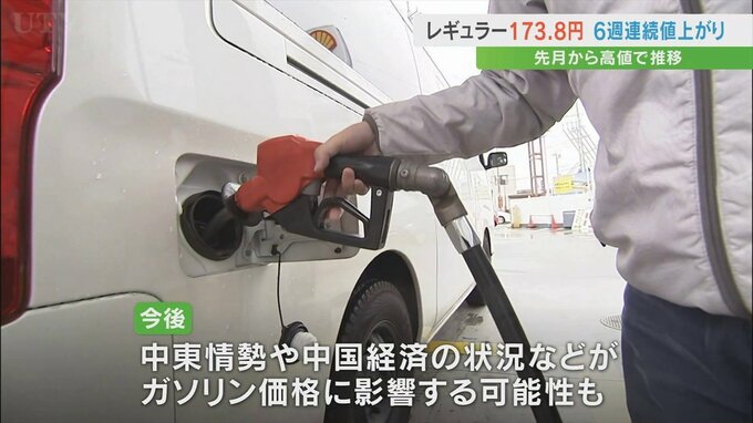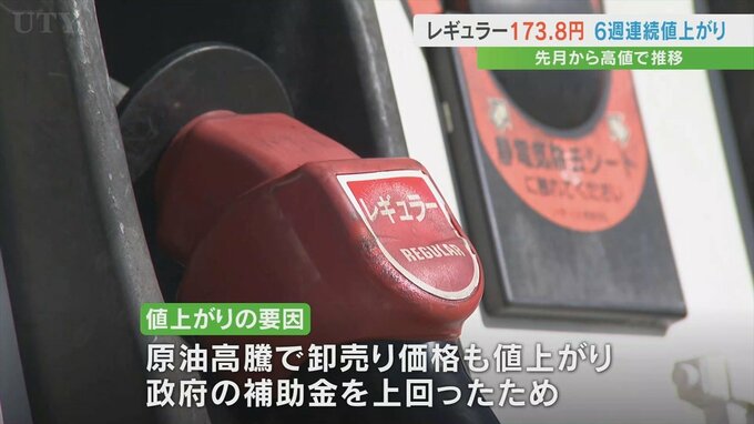 山梨県内のレギュラーガソリンの価格は6週連続で値上がりし1Lあたり173.8円となりました。
