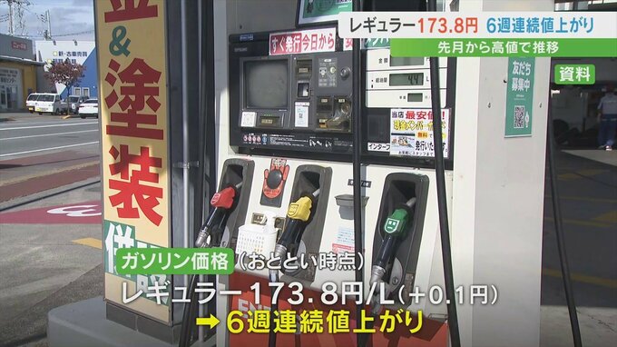 資源エネルギー庁によりますと、9月30日時点の県内のレギュラーガソリンの平均小売価格は、1L173.8円で前の週より0.1円値上がりしました。