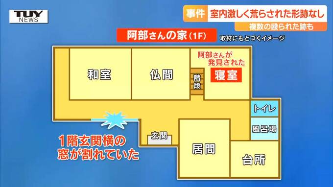 また、玄関横の窓ガラスが割られていて、警察では、この窓がある1階から犯人が侵入した可能性もあると見て捜査を進めています。