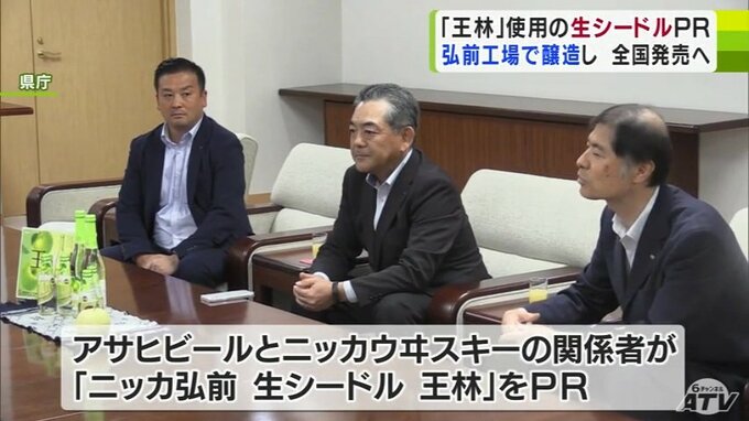 県庁の宮下知事を訪ねたのは「アサヒビール」と「ニッカウヰスキー」の関係者で、まもなく全国発売される「ニッカ弘前 生シードル 王林」をPRしました。