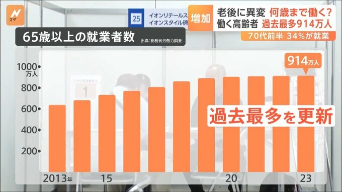 総務省労働力調査によると、65歳以上の就業者数は増加を続けていて、2023年は914万人と、過去最多を更新したということです。