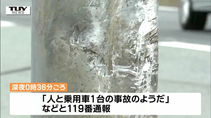 現場は片側2車線の信号機や横断歩道のある交差点で、横断歩道そばの電柱の一部が損傷しているほか、タイヤ痕が残されていました。午前0時36分ごろ「人と乗用車1台の事故のようだ」などと119番通報があったということです。