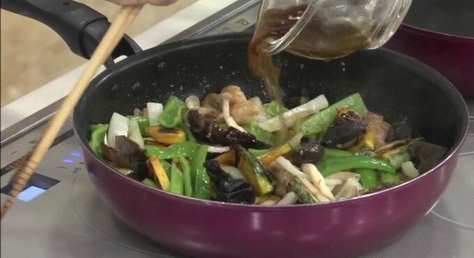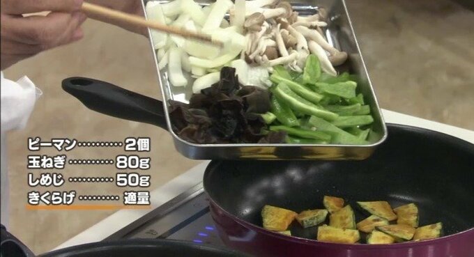 2.フライパンに油を引き、かぼちゃを炒める。その後、ピーマン・玉ねぎ・しめじを入れて炒め、全体に油が回ったらきくらげを加え、しんなりしたら取り出す。