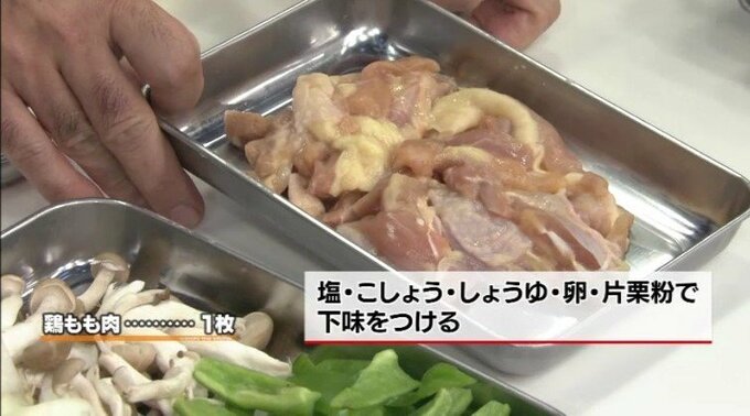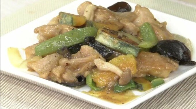 1. 鶏ももは観音開きにして一口大に切り、下味(塩・こしょう・しょうゆ・卵・片栗粉※分量外)をつける。かぼちゃはスライス。玉ねぎ・ピーマンは一口大にカット。しめじはばらす。きくらげは戻して一口大にカットする。