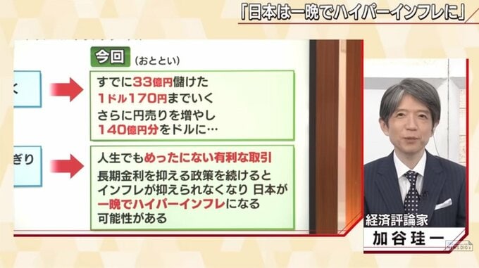 もし日米の金利差が4%か5%になれば、日本人も皆、円を売ってドルを買うでしょう。そうすればドルは上昇を続け、円は下落し続けます。ここまで有利な取引は人生でも滅多にありません。(中略)日銀が長期金利を抑え続けていると、インフレは手が付けられなくなり、日本は一晩でハイパーインフレになる可能性があります。日本人はこの政策によって貧しくなるでしょう」