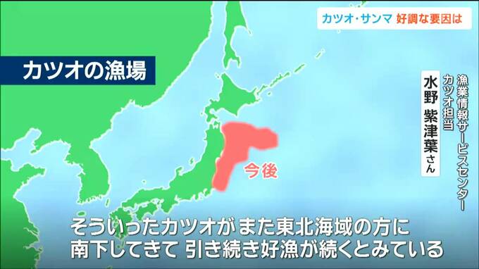 「今年は暖かい水が東北海域の広い範囲に広がっていて、カツオが来遊しやすい状況。今年は東北海域に漁場が形成されるのが少しいつもより早かったので、東北で水揚げされる期間がいつもより早かったこともある」