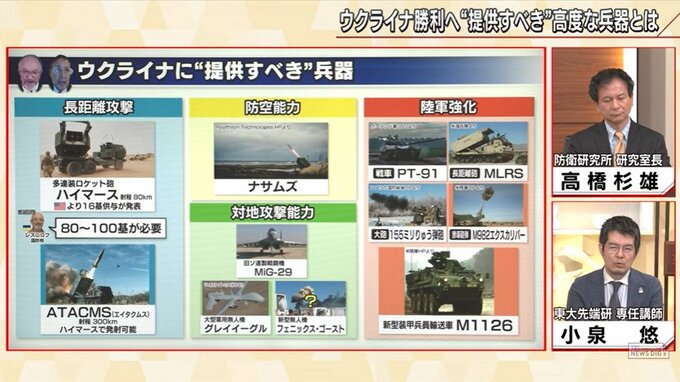 だから早期に強力な武器をウクライナに提供して、膠着状態からウクライナ優勢に持っていき有利な立場で和平に持ち込みたい。そのために必要な武器が具体的に挙げられた。