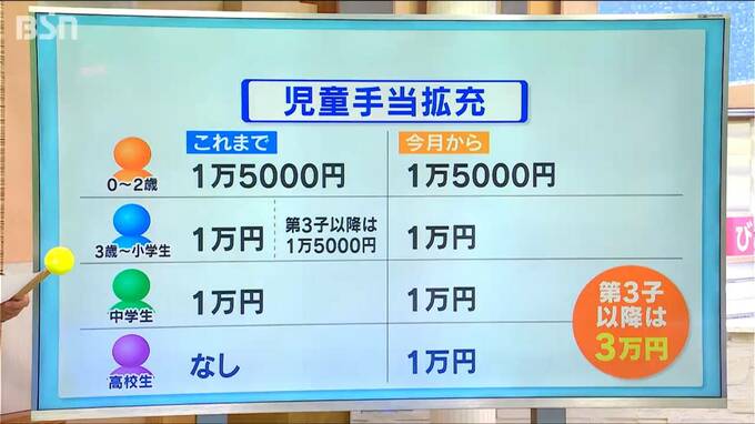 これまでは高校生の支給はなく、3人目の子どもが3歳から小学生までであれば1万5千円が支給されていました。それが、第3子以降の支給は0歳から高校生までの年代が対象となり3万円まで引き上げられました。