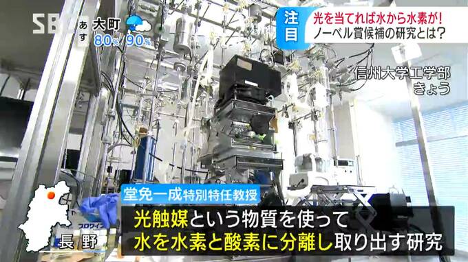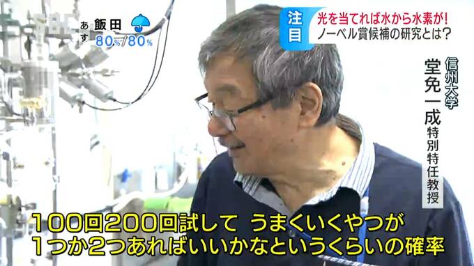 信州大学の堂免一成特別特任教授が研究しているのが、光触媒という物質を使って水を水素と酸素に分離し、効率良く取り出そうというプロジェクト。
