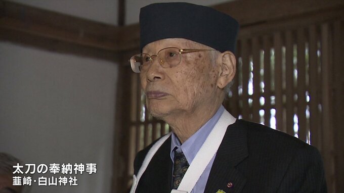 神事のあと大村智さんの名前が刻まれた長さ約80cmの太刀が披露されました。
