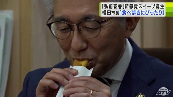 櫻田市長は、さっそく2種類の弘前春巻を味わいました。