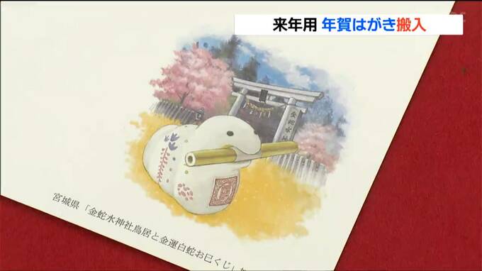 来年用の年賀はがきは全部で7種類あり、このうち宮城県版のはがきは来年の干支ヘビにちなんで岩沼市の金蛇水神社の絵柄があしらわれています。