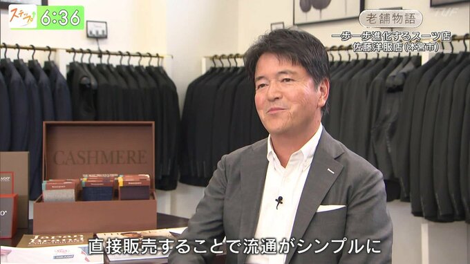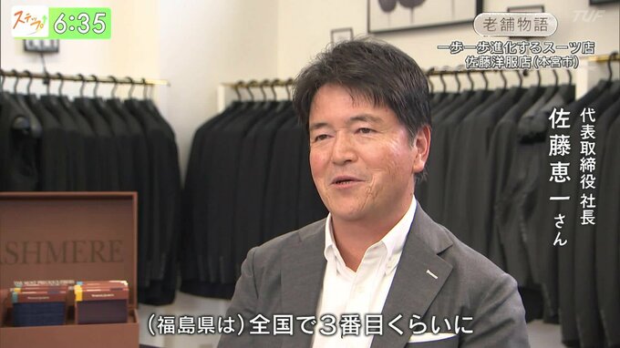 ---佐藤社長「昔は(福島県は)全国で3番目くらいに繊維従事者が多い件だったんですけど、今は10分の1くらいまで減った。これからどうやって生き残って行こうかという中、昔に戻って注文洋服のような、直接お客様に販売する形に。」