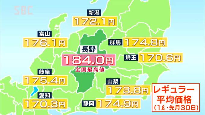 長野県内のガソリン価格はレギュラーが184円で前の週より0.1円値上がりし、8週連続で全国最高値となりました。資源エネルギー庁によりますと、9月30日時点での県内のガソリン1リットルあたりの平均小売価格は、レ…