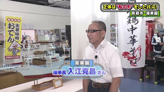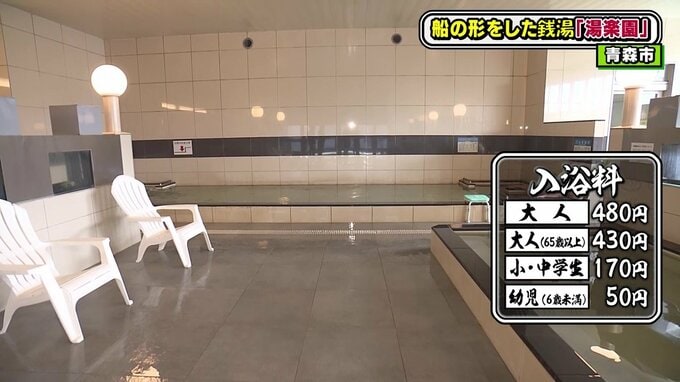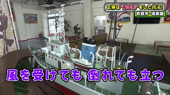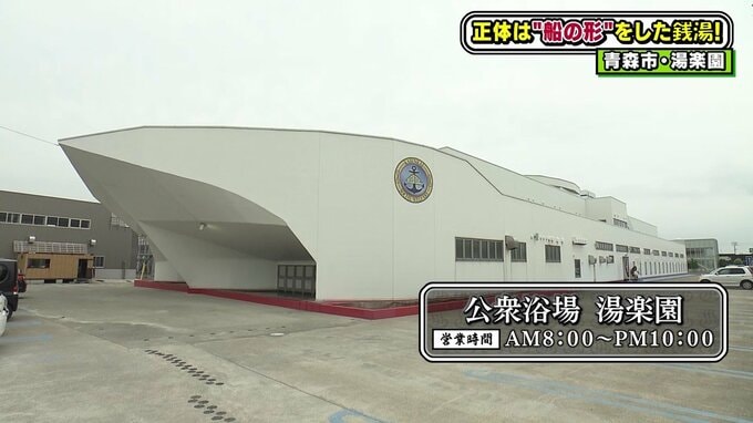 “本来海にあるものが陸にある”の答えは船。『公衆浴場 湯楽園(ゆらくえん)』です。ちょっとお風呂には思えない見た目です。それにしても、なぜ船の形なのでしょうか。