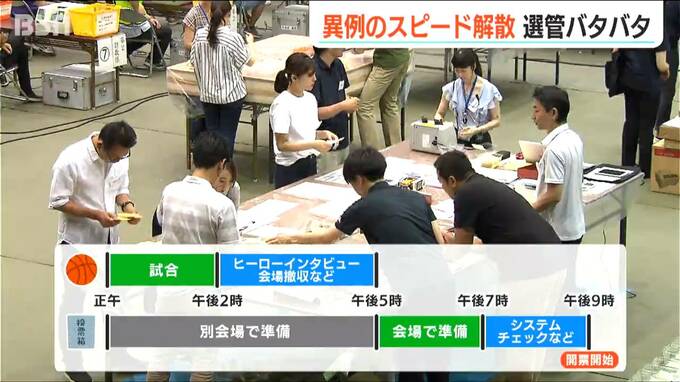 試合は、正午にスタートし午後2時ごろ終わります。その後、ヒーローインタビューやブースターの退場、会場の撤収作業があるため、体育館が空くのは開票作業のわずか4時間前、午後5時ごろになりそうです。